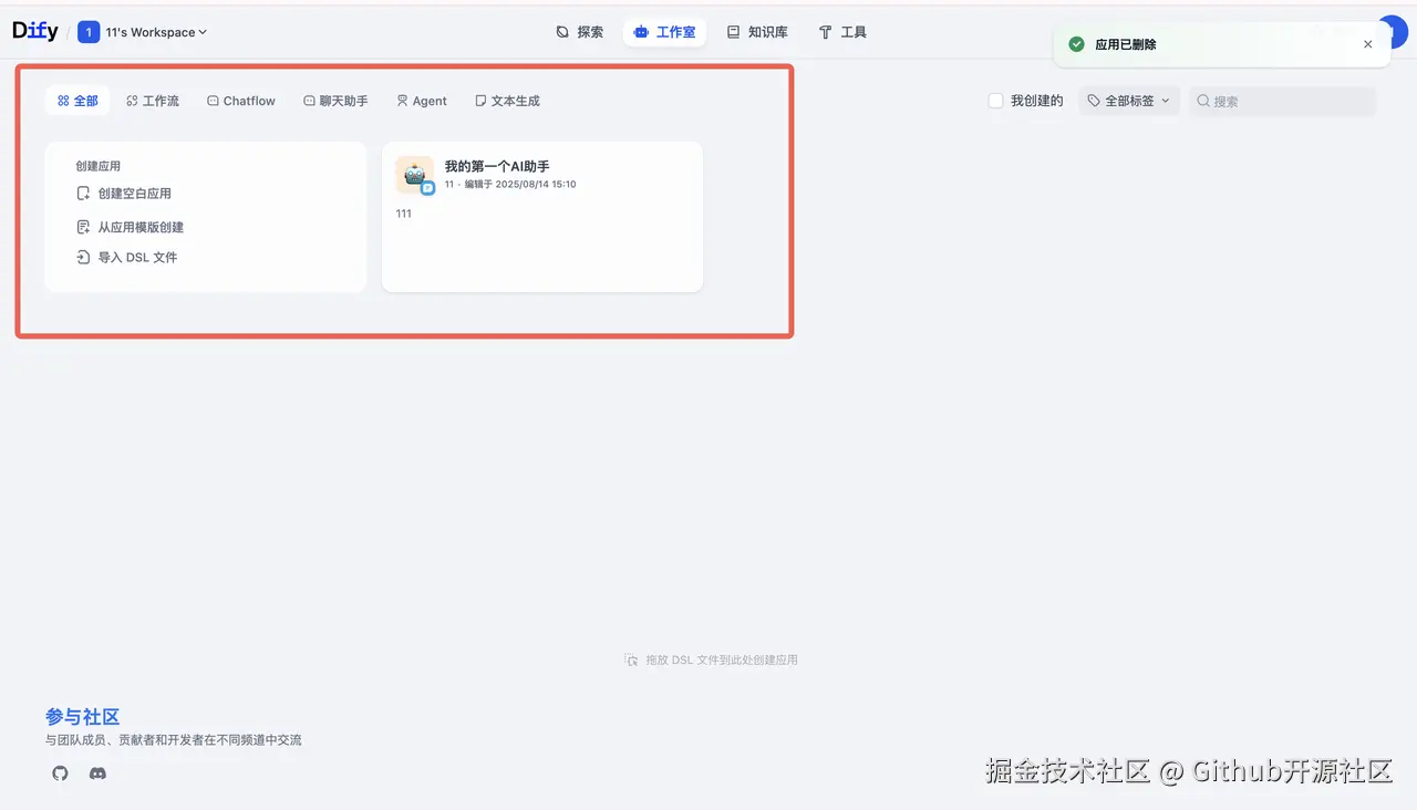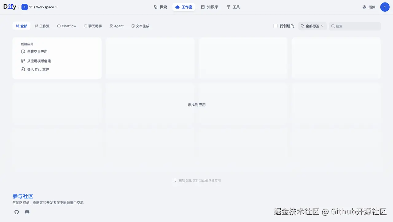 完成设置后,你就正式进入了 Dify 的主工作区。一个专属于你的、功能强大的 AI 应用开发平台,就此诞生!