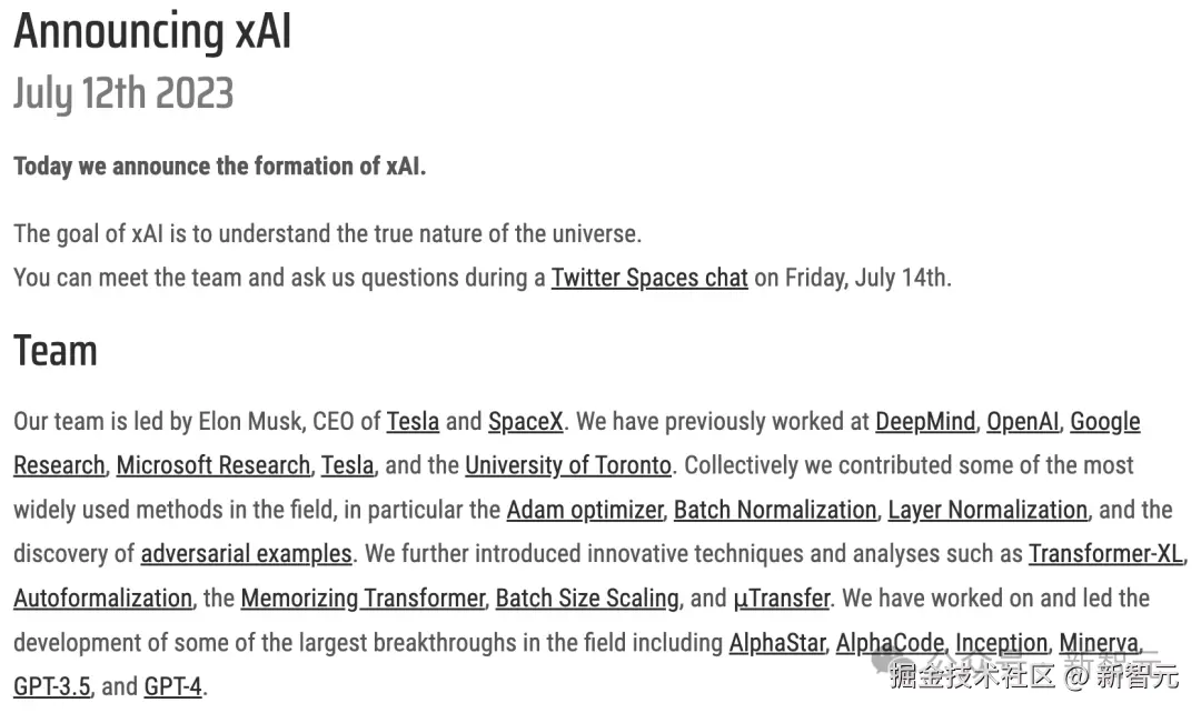 2023 年 7 月 13 日,马斯克高调官宣 xAI 新公司成立,以探索宇宙本质为终极目标,打造一个能够理解宇宙的超级 AI。