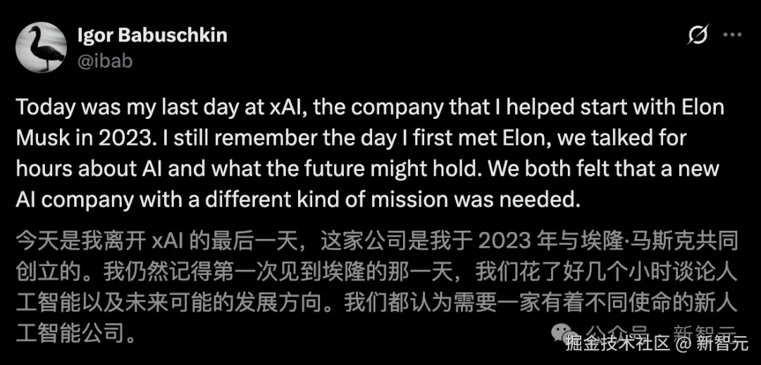 「【新智元导读】xAI 又一位联创官宣离职了!AlphaStar 之父 Igor Babuschkin 发长文告别,回忆曾带队爆肝 120 天造出全球最强超算,老马亲自下场致谢:没有你就没有 xAI 的今天。」