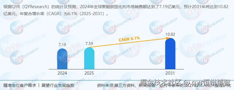 根据QYResearch最新调研报告显示,2024年全球聚醚胺固化剂市场规模达7.19亿美元,预计2031年将增至10.82亿美元(CAGR 6.1%)。中国作为全球第二大消费市场,2024年市场规模占比约26%,预计2031年占比将提升至30%以上。风电行业需求占比超45%,是核心增长引擎;建筑涂料、电子封装等领域需求增速达12%-15%。本文从产业链结构、竞争格局、技术趋势及政策驱动等维度,解析行业增长逻辑与投资机遇。