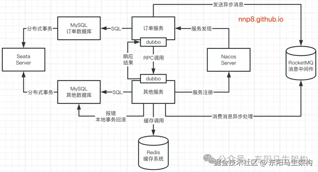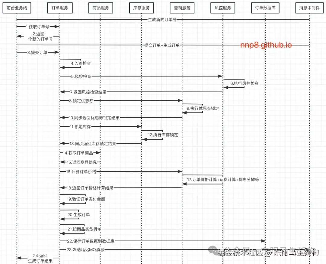 生成订单是电商系统最核心的正向业务流程,涉及多个微服务的协同工作,关键节点说明如下:
