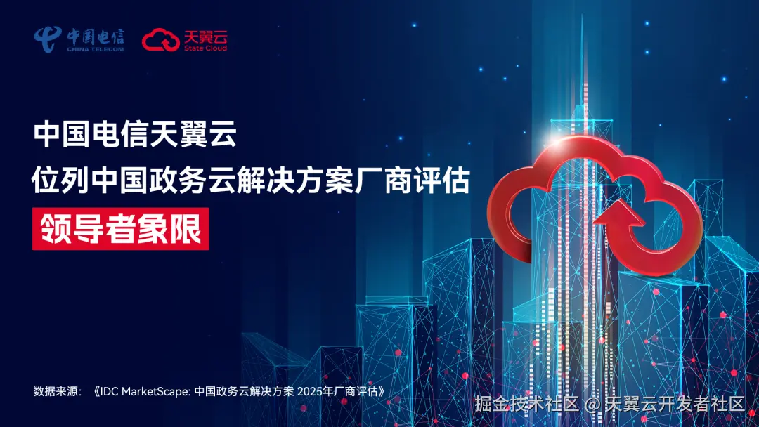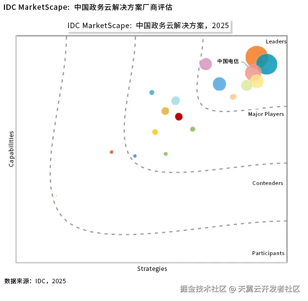 近日,国际数据公司(IDC)发布的《IDC MarketScape:中国政务云解决方案2025年厂商评估》报告显示,中国电信天翼云在该项评估中位列领导者象限,持续领跑政务云市场。