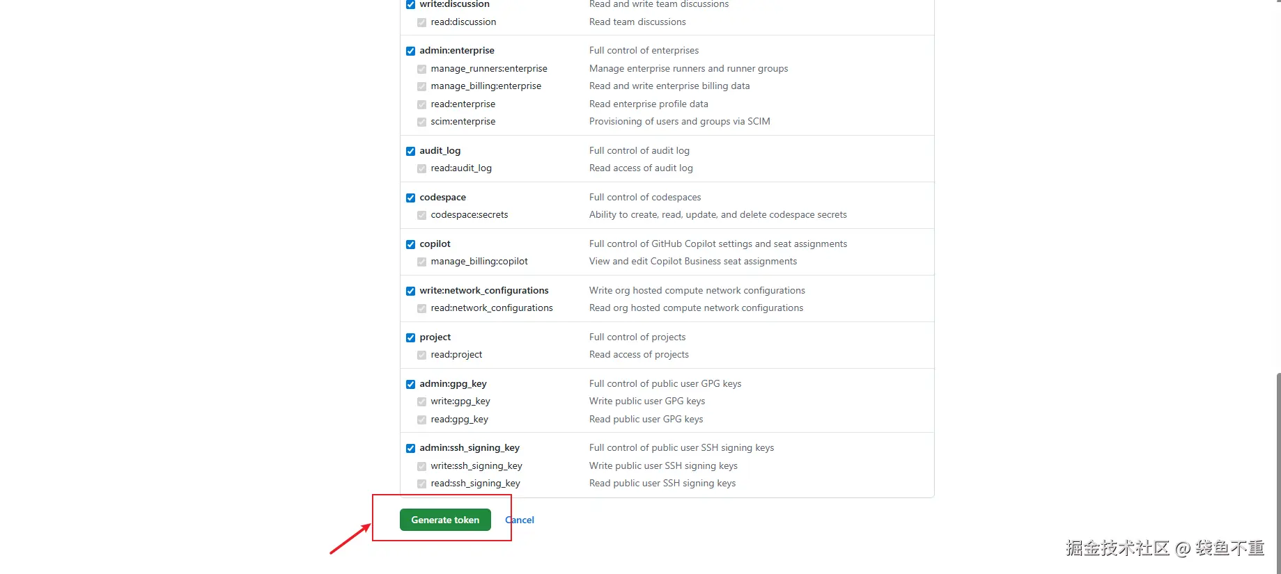 到github中创建一个 Personal access token(个人访问令牌),注意访问令牌只可查看一次,记得复制保存后再关闭