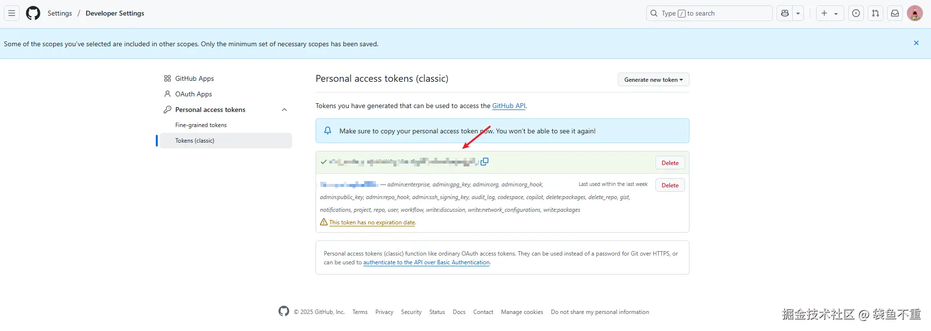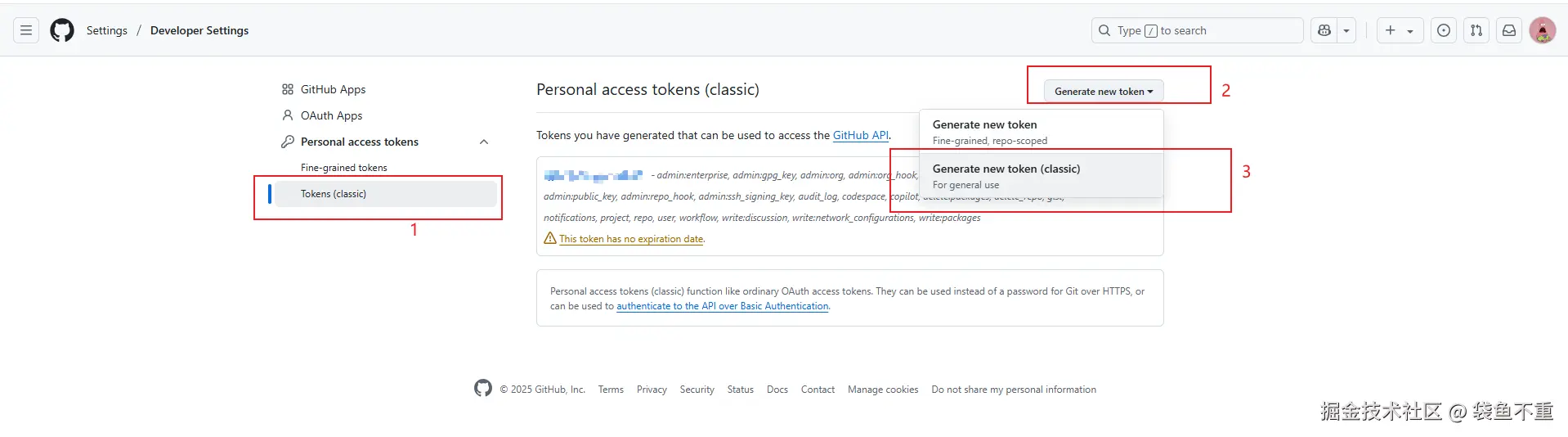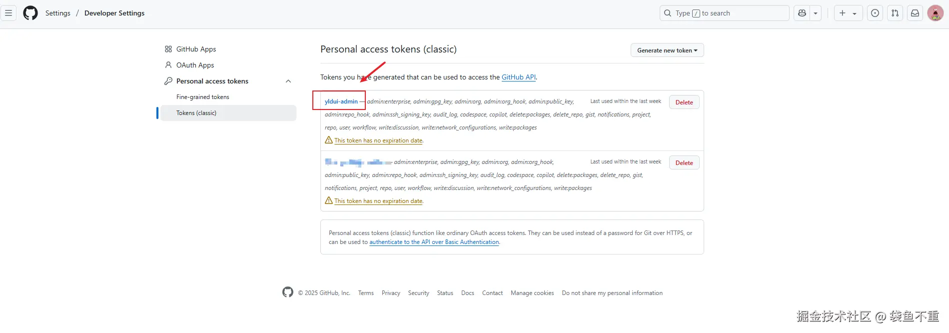 点击左侧菜单最底下的 Tokens(classic),新建一个 token。