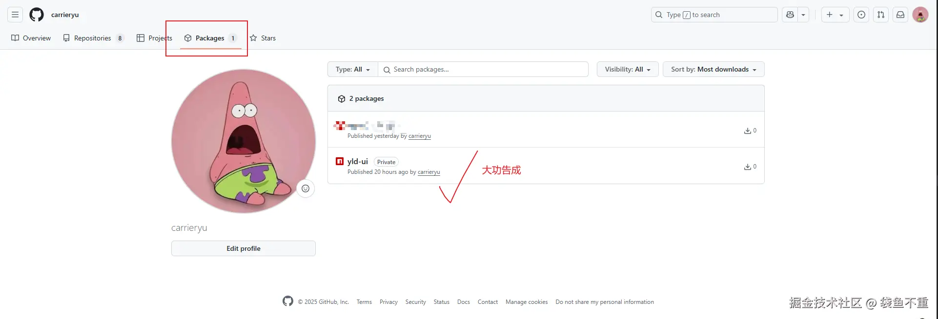 如果显示的是 registry.npmjs.org/,说明你发布到了公共 npm,而不是 GitHub Packages。