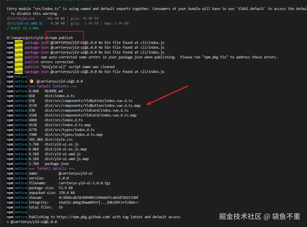 执行打包命令 npm run build:lib,然后执行 npm publish 发布。可以看到 dist 文件夹就被打包发布到线上了。