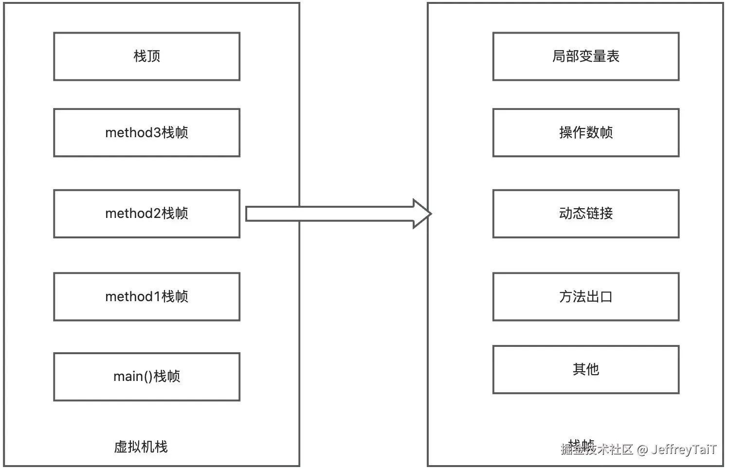 每个方法被执行时,虚拟机都会同步创建一个栈帧(Stack Frame)用于存储局部变量表、操作数栈、动态连接、方法出口等信息。