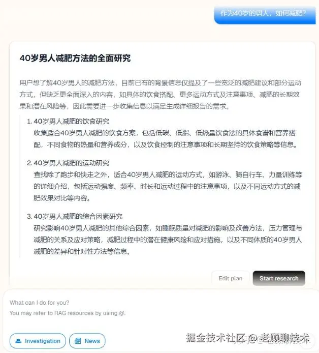 用户提出的问题:作为40岁的男人,如何减肥?规划者Planner会结合背景调查进行分析,输出40岁男人减肥在哪些方面进行研究;分了3个步骤(包含标题,描述)。