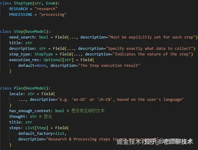 Plan计划对象里面有个steps步骤对象,Step步骤对象里面有title标题,description描述,step_type有2个枚举,这2个枚举表示将来调用的工具(research会调用搜索引擎,processing会执行python脚本)
