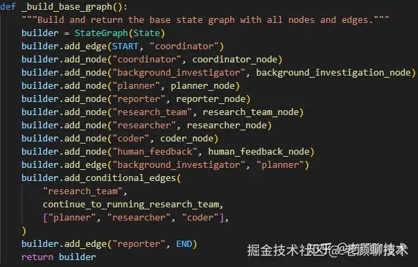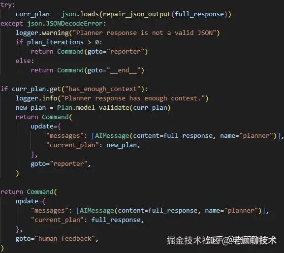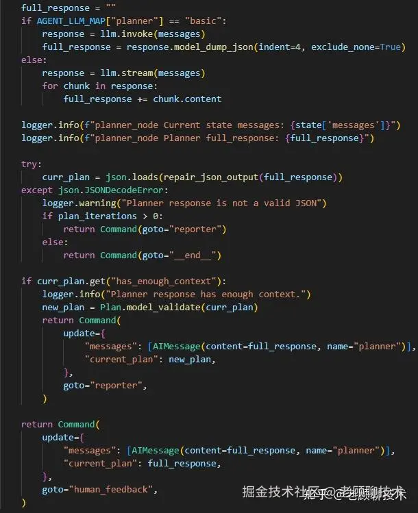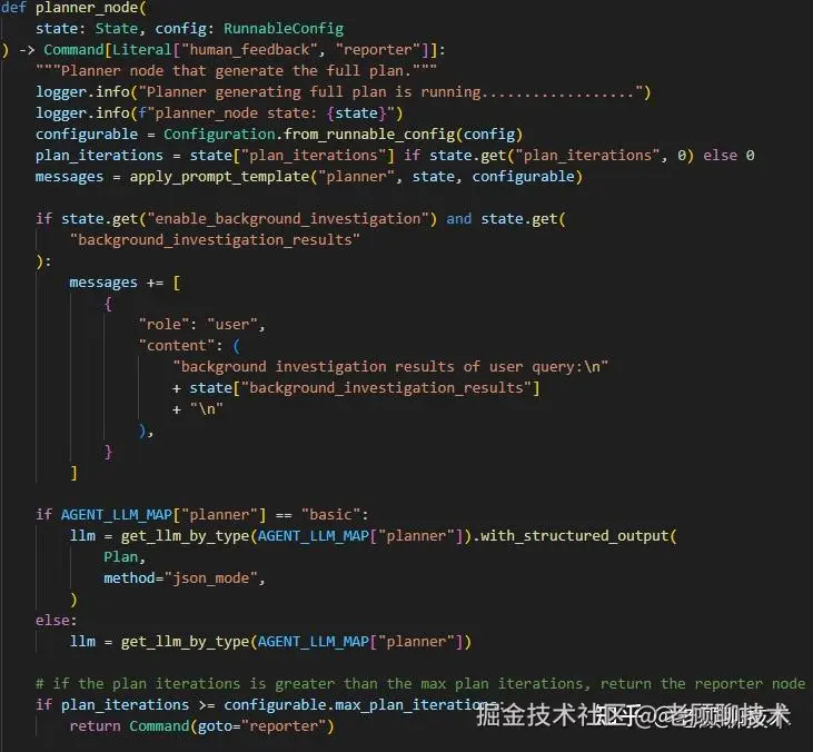 背景调查后会调用规划者Planner;后续的处理是在Planner代码中,进行动态的流转(节点human_feedback或节点reporter)