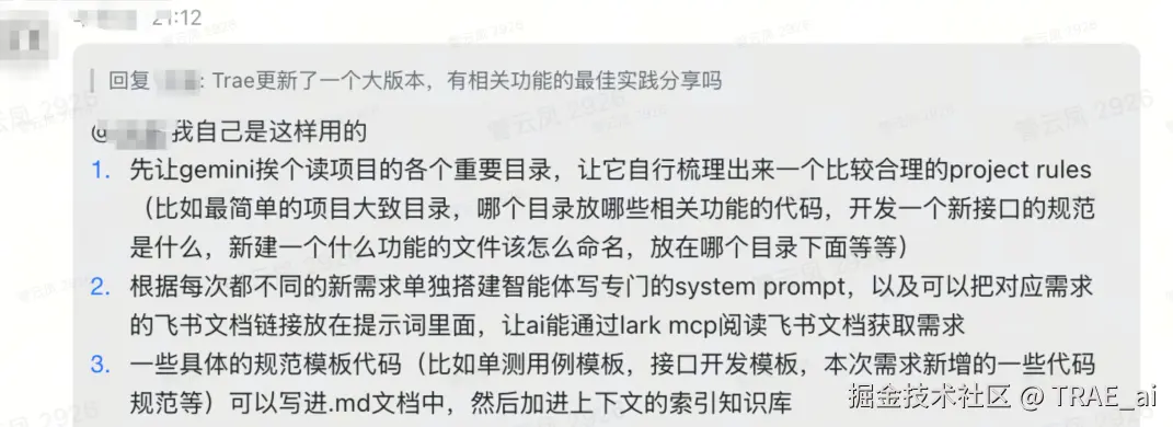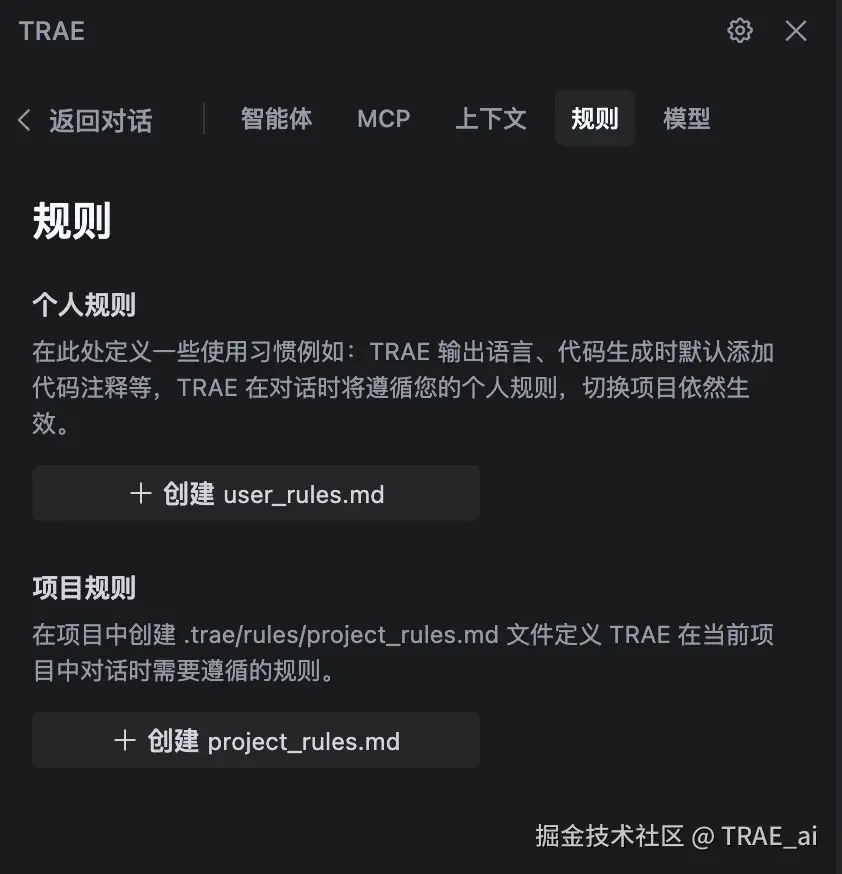 💡 团队规范转换技巧: 将团队现有的规范文档上传到 TRAE 的文档集中,然后在聊天框中引用该文档,告诉 AI:“我想把这个文档变成一个团队规范,请帮我聚合以及凝练一下。” AI 会根据文档内容和要求生成优化后的规则,可以直接复制到 project_rules.md 中。