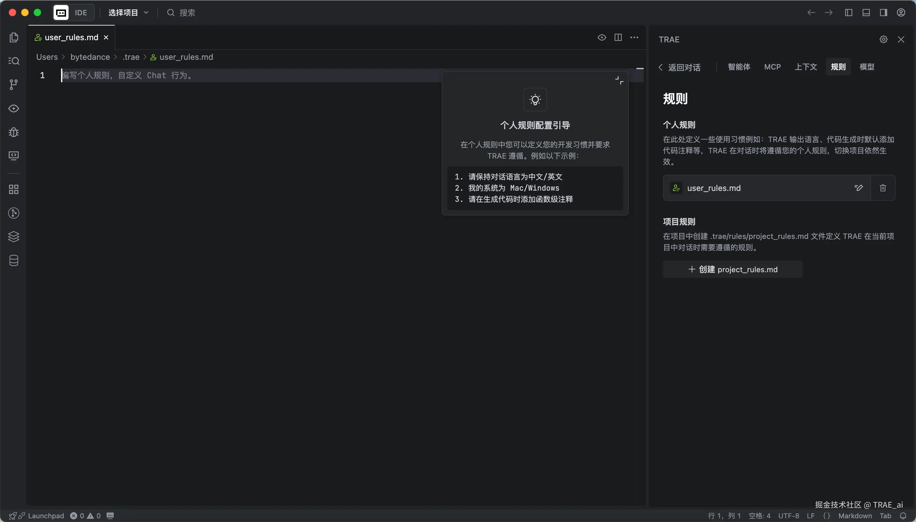 如果希望所有智能体都能使用某些项目规范或个人习惯,应该将其放在 project_rules.md 或 user_rules.md 中,例如