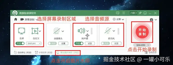 步骤2:接着来定制你的专属录制方案,先框选出准备录制的区域。也别忘记这款软件默认是静音模式,要手动开启 “扬声器” 和 “麦克风” 哦!如果想给作品盖个专属印章,可以去 “图片水印” 设置里上传你的logo,调整透明度和位置超方便!所有参数调好后,点击红色录制按钮正式开录!