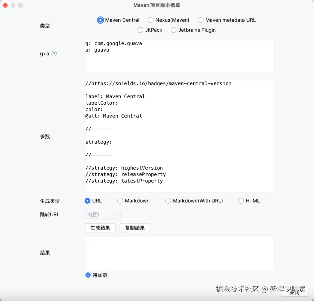 支持快速生成常见Maven项目版本的徽章 (依赖shields.io能力)。提供常见参数使用,可快速自定义文本及颜色。提供支持groupId+artifactId快速输入能力(如Maven pom配置或Gradle依赖配置粘贴即可),并内置常用徽章的跳转链接(如发布到中央仓库release jar的版本链接)及自定义跳转链接,为您徽章的生成提供一定的便捷~