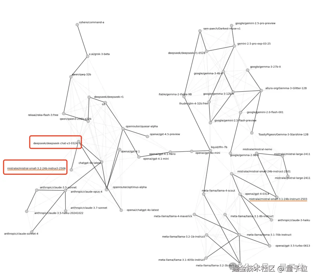 通过比较相似性图中模型的远近位置,就可以发现 Mistral-small-3.2 和 DeepSeek-v3 在图中非常接近,这就表明了它们的输出模式高度相似。