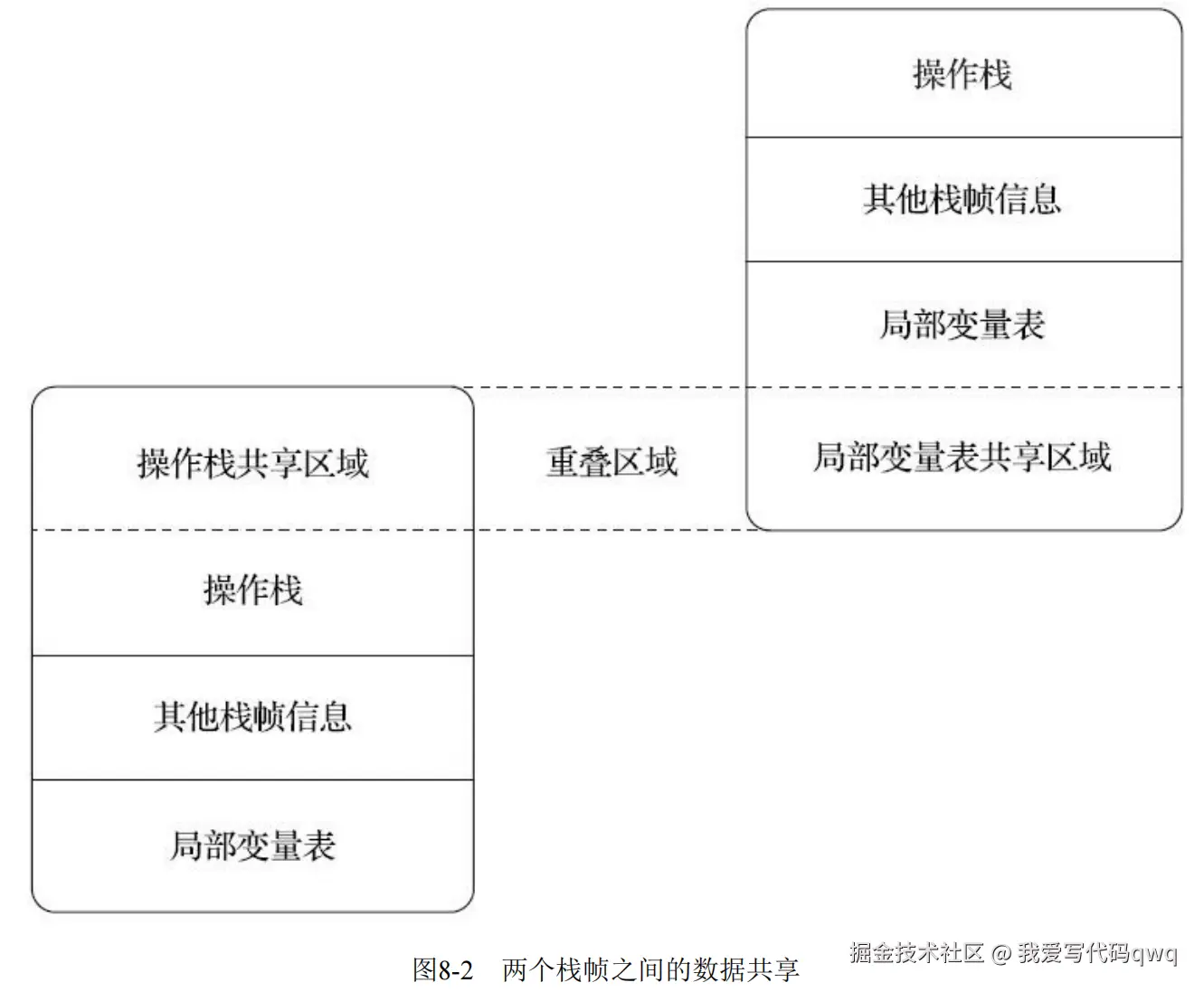 在概念模型里,两个不同栈帧作为不同方法的虚拟机栈的元素,是完全相互独立的。但会允许栈帧进行重叠,这样可以节约空间以及共用一部分数据。概念模型如下所示: