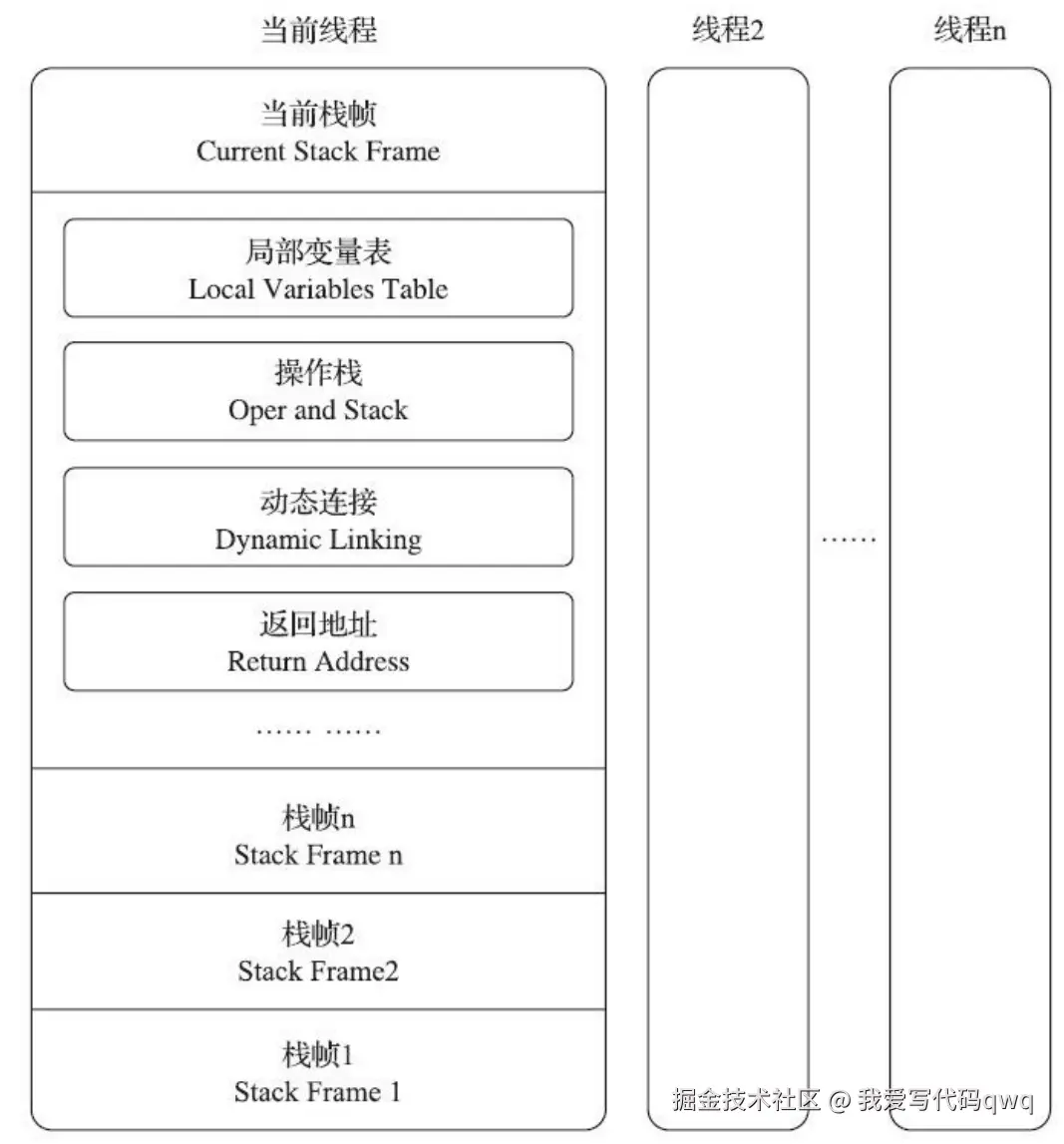 一组变量值的储存空间,用于储存方法参数和方法内部定义的局部变量;