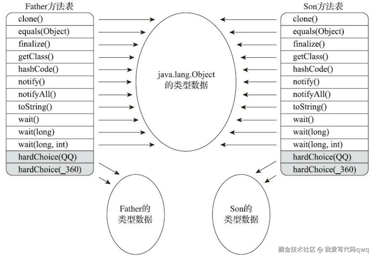 如果某个方法在子类中没有被重写,那子类的虚方法表中的地址入口和父类相同方法的地址入口是一致的,都指向父类的实现入口。如果子类中重写了这个方法,子类虚方法表中的地址也会被替换为指向子类实现版本的入口地址。