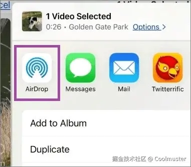 步骤1. 确保您的iPhone和Mac都连接到同一个Wi-Fi网络,并且两台设备上都启用了AirDrop。在iPhone上,打开“照片”应用程序,然后选择要传输的视频。然后点击“共享”按钮,然后点击AirDrop图标。