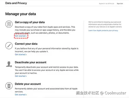第 2 步:进入 Apple ID 和隐私页面后,单击该部分下的“开始”以获取数据副本。