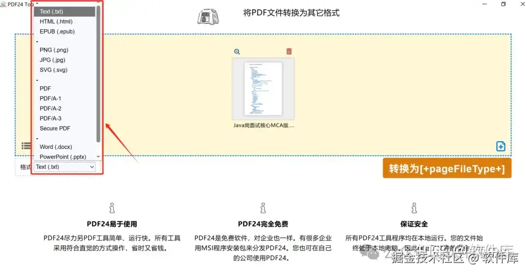 例如,我们最常使用的功能是将PDF转换为其他格式的文档。目前,该软件支持多种格式的转换,包括但不限于txt、png、jpg、svg、docx、pptx以及excel等,几乎涵盖了所有办公所需的基本格式!