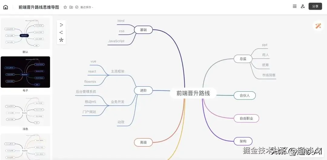 思维导图工具支持节点拖拽、样式自定义,切换不同风格主题,还能导出成图片或 JSON文件。