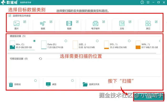 步骤1: 在软件的首页上勾选目标数据的类型,然后还需要选择进行扫描的位置,选好之后再按下“扫描”的按钮,让软件进行扫描。