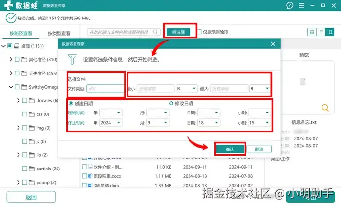 步骤2: 扫描完成后,发现扫描出五位数这么多的文件,这该怎么办呢?可以在页面上方点击“筛选器”,设置目标文件的相关信息,点击“确认”,等待软件的搜索完毕后,我们要进行筛选的文件就变少了。