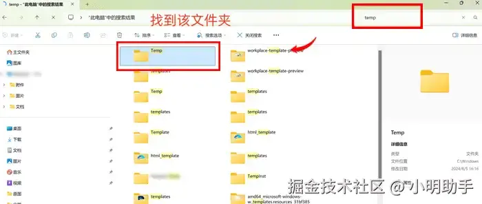 打开“此电脑”,在右上角的搜索框中输入“temp”,等待电脑搜出同名文件夹。