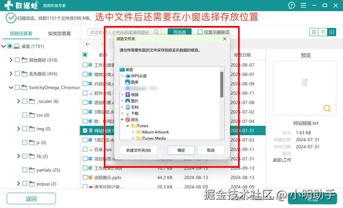 选好文件后按下“导出”按钮,然后在小窗口中选择恢复文件的存放点。