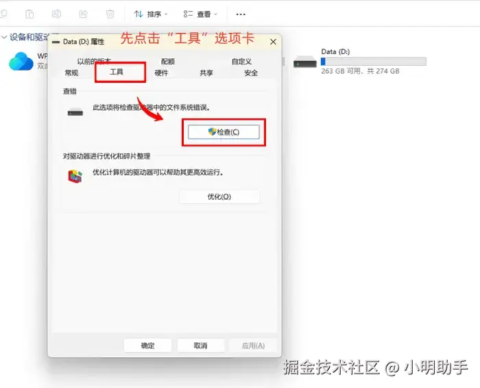 操作2: 在“属性”页面中打开“工具”选项卡,再按下“检查”按钮。
