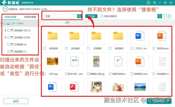操作2: 扫描出的文件如果太多,还可以选择上方的“搜索框”进行目标文件的精准搜索(只需要输入关键词即可)输入后按下旁边的放大镜就能开始搜索。