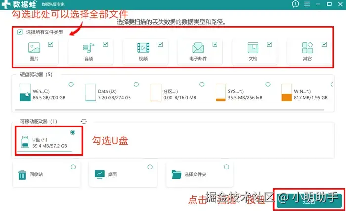 操作1: 在电脑中打开软件,进入首页后,我们就能根据提示选择目标数据类型,再选择目标U盘进行扫描,选好后点击“扫描”按钮。