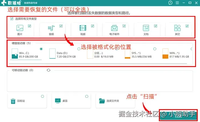 步骤1: 通过软件首页,我们可以根据指示选出需要扫描数据类型和扫描位置(即被格式化操作的硬盘),选确认两项都选择完毕后,再按下按钮开始扫描。