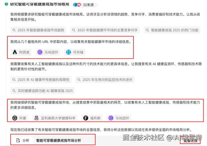第一步:它开始去分析市场趋势、主要竞争对手(Oura Ring, Samsung Ring等)、消费者偏好和技术能力。
