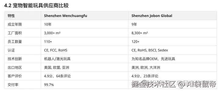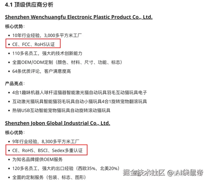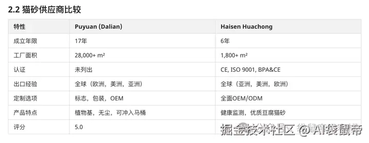 它为每一个品类,都推荐了2家最合适的供应商,并且给出了详尽的分析对比: