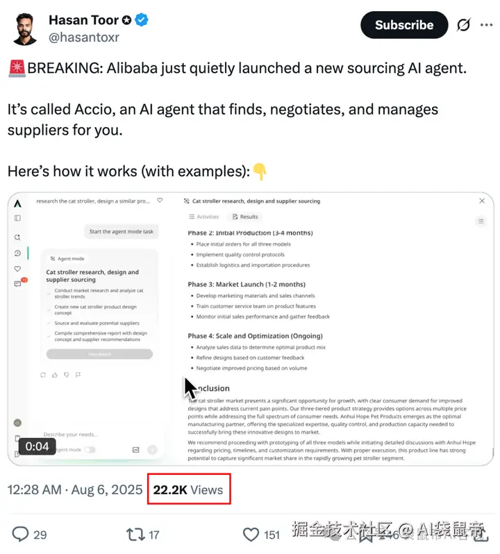 简单说,Accio是面向海外买家侧的AI原生应用,主打B2B跨境采购,这次刚刚升级了Agent版本。