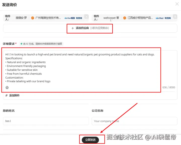 还可以在它推荐的供应商列表里添加其他需要发送询价的供应商,点击发送,这些询盘就能一键发往各个工厂。