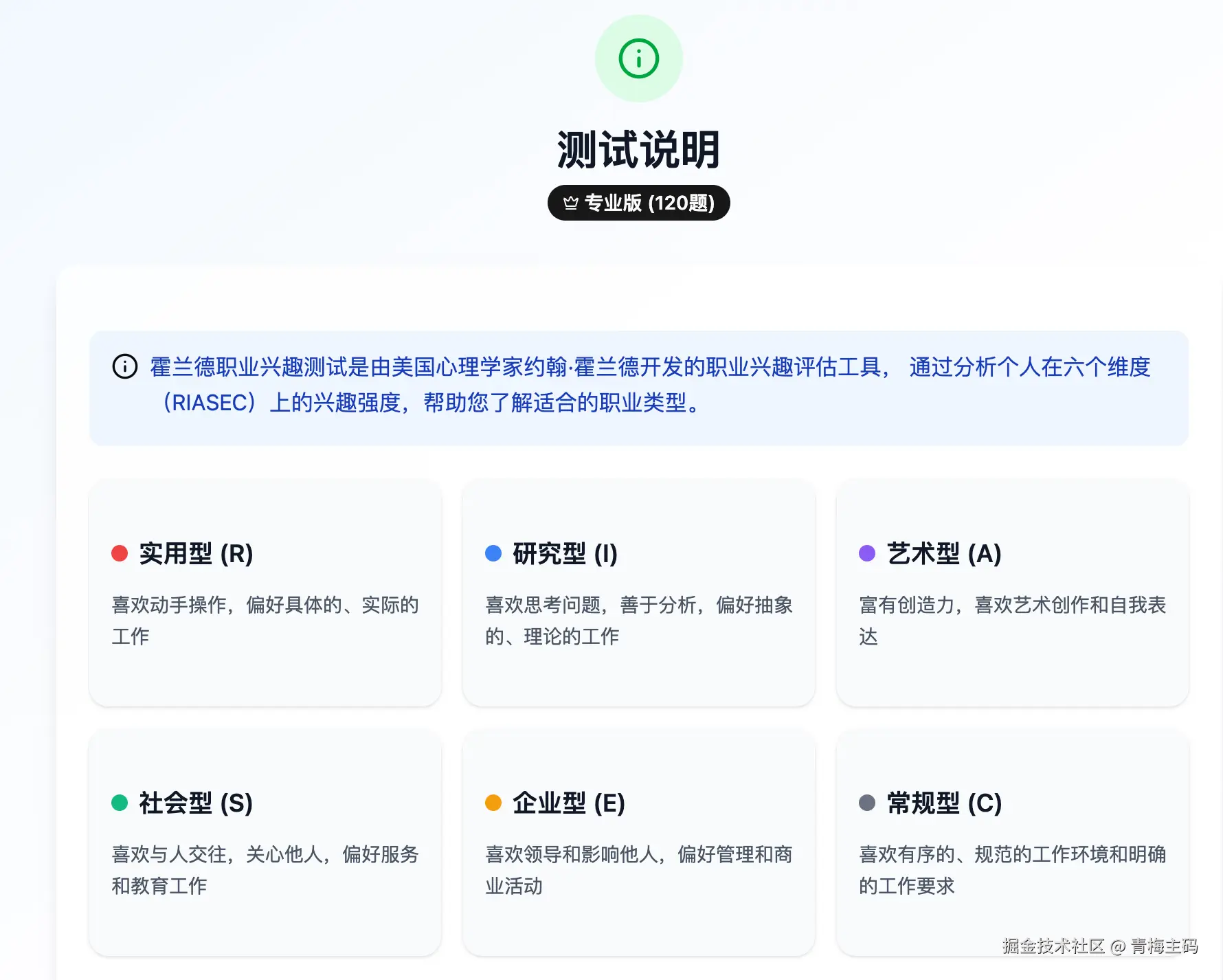 有一款霍兰德职业兴趣测试工具 www.tooljson.com/holland-voc…,正是基于这一科学理论精心设计而成。它通过一系列严谨、科学的测评题目,深入了解测试者的兴趣爱好、工作价值观以及行为倾向,从而精准分析出出测试者的职业兴趣类型。与其他同类测试相比,这款工具具有以下显著优势: