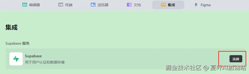 接着点击创建项目,会打开supabase网站创建一个新项目,创建成功后,集成中就会显示这个新项目了,接下来点击连接按钮,就可以直连刚刚创建的新项目了。