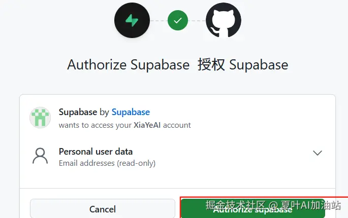 SOLO模式下打开集成面板,点击连接supabase,会打开浏览器界面进行授权,这里我用github账号直接授权。