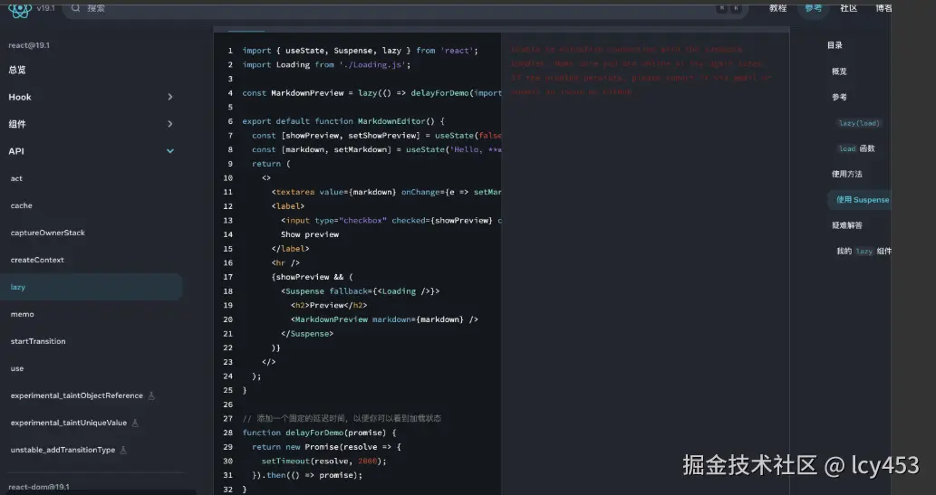 需要一个suspense容器组件包裹懒加载的子组件。子组件通过React.lazy回调函数的方式引入渲染。