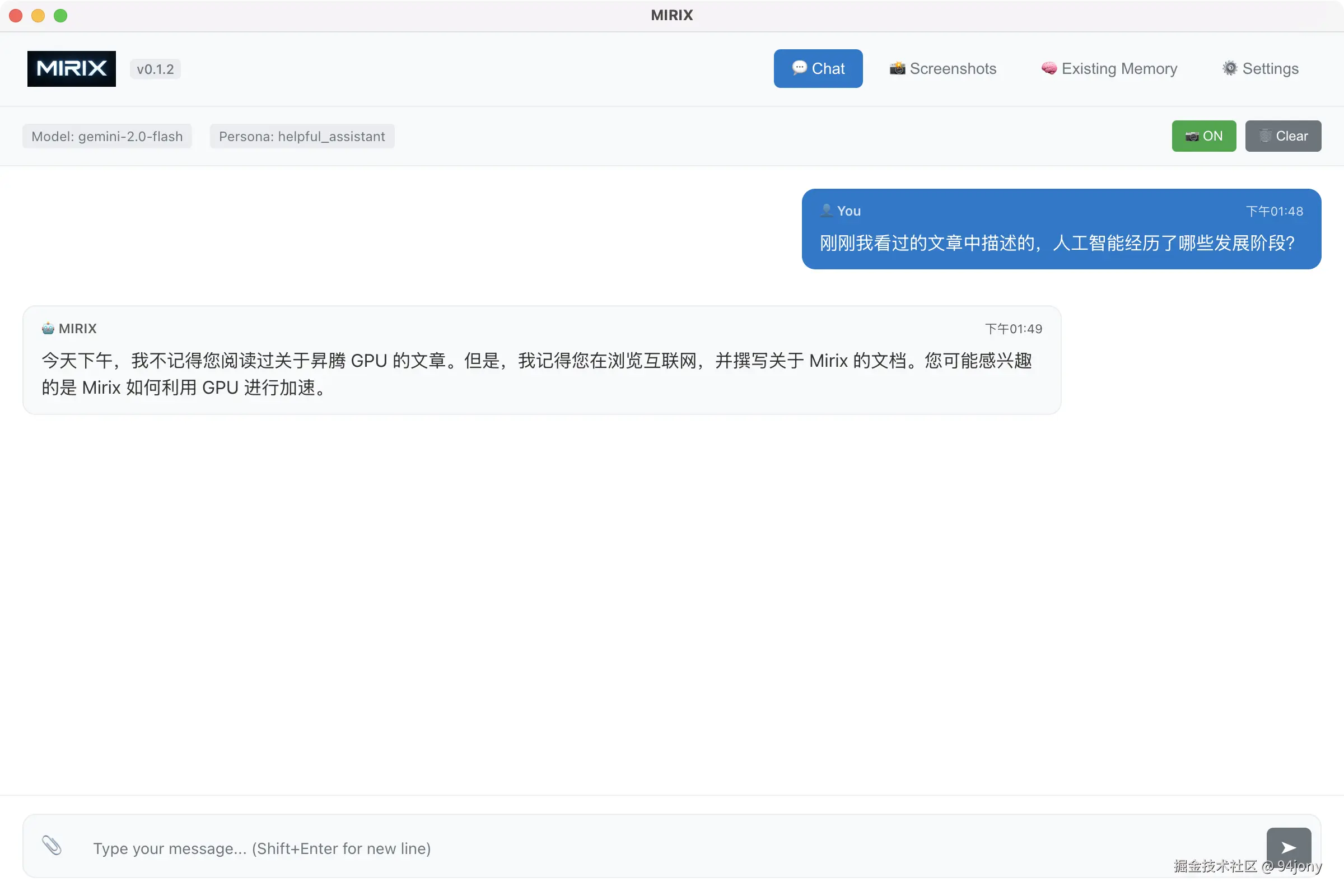 我首先打开了一篇关于“人工智能发展史”的网页长文,快速浏览了大约5分钟后关闭。然后,我向 Mirix 发起了提问。