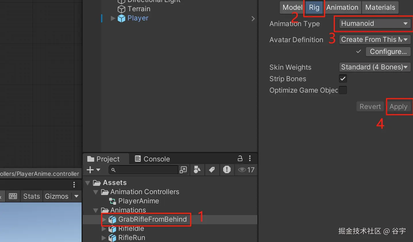 1.第一步我们选中“拔枪动画”,然后点击右侧面板中的“Rig”页签,接着我们把选项“Animation Type”的值,切换成“Humanoid”,最后点击“Apply”应用按钮即可。