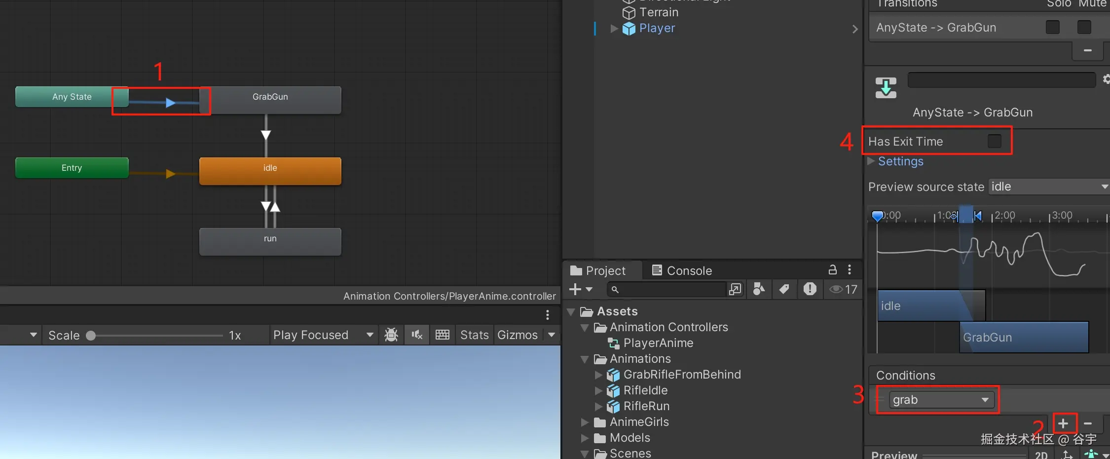 4.第四步选中“Any State”(任何状态下)的节点与“GrabGun”(拔枪动画)之间的过渡线,随后右侧菜单中,点击“Conditions”列表下的“+”号,添加“grab”变量来触发拔枪动画。最后记得把“Has Exit Time”的勾选去掉,因为拔枪动作可以随时发生。