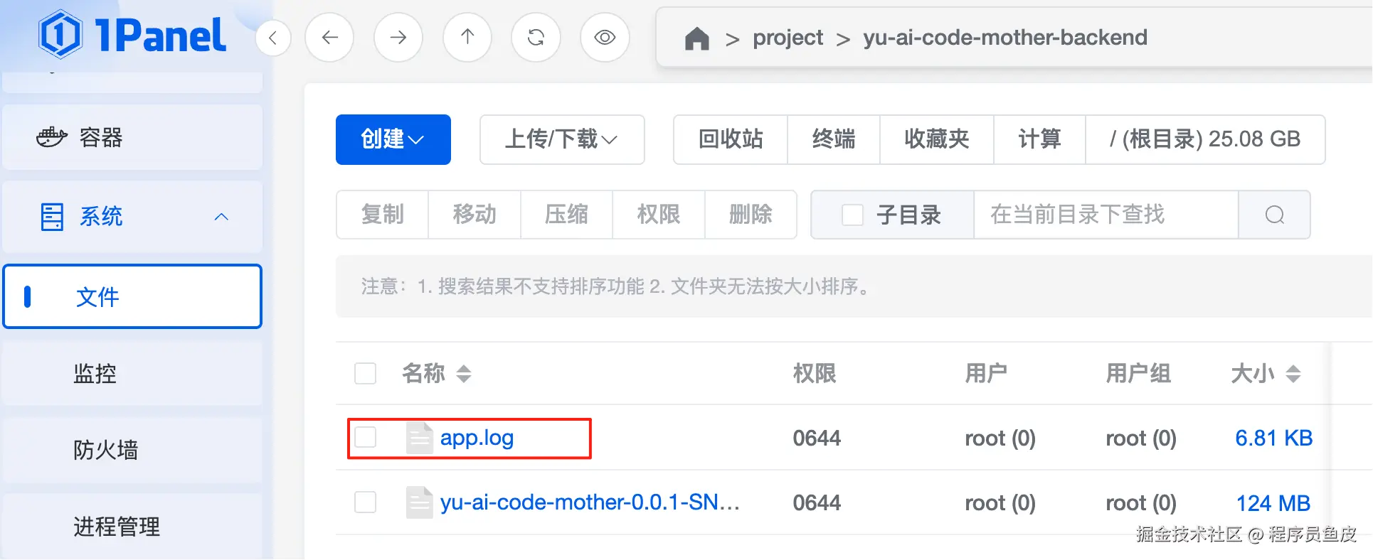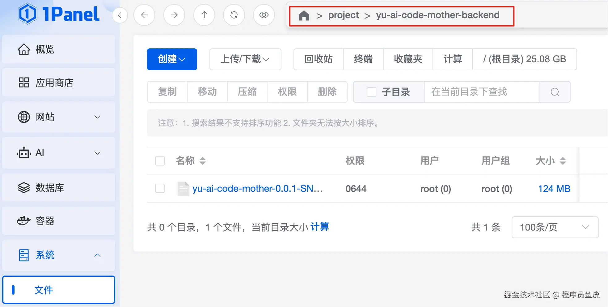 将打好的 jar 包通过面板上传到服务器的指定目录下,我这里是 /project/yu-ai-code-mother-backend: