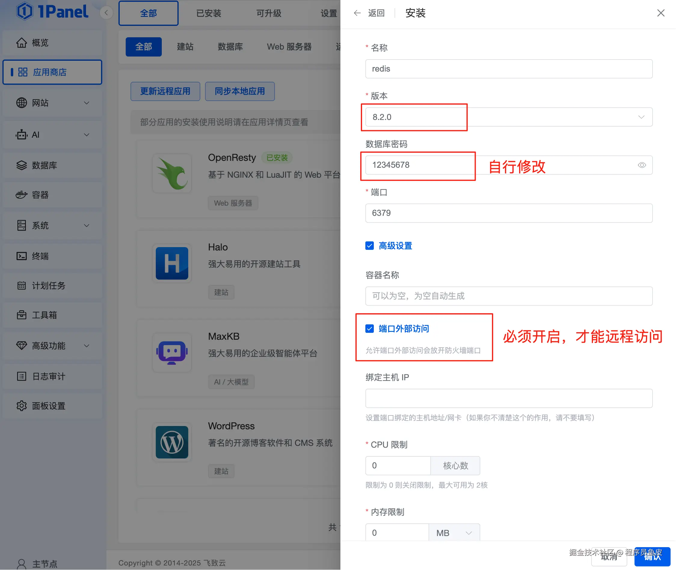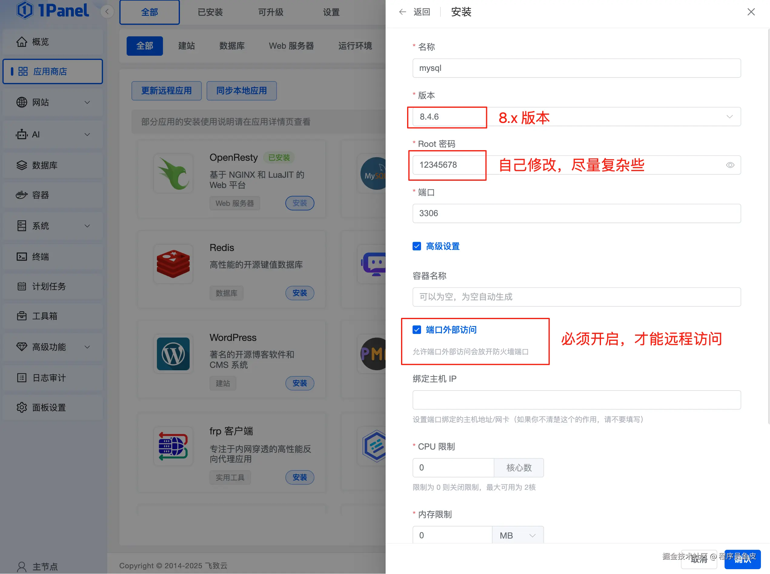安装时选择 8.x 版本、修改 Root 密码、开启端口外部访问: