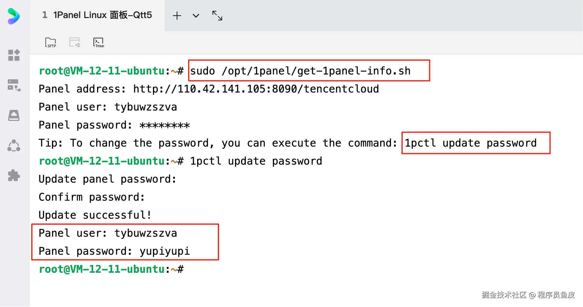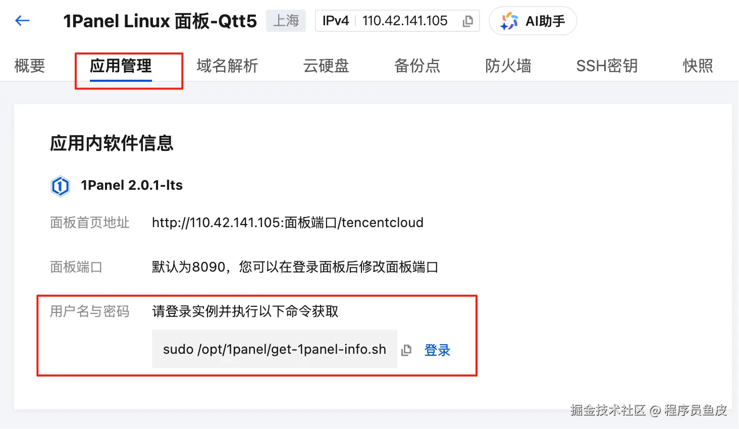 购买好服务器后,进入服务器控制台的应用管理页,登录 1Panel 面板。首次登录时,需要先登录服务器,通过输入命令的方式获取面板的默认账号密码,如图:
