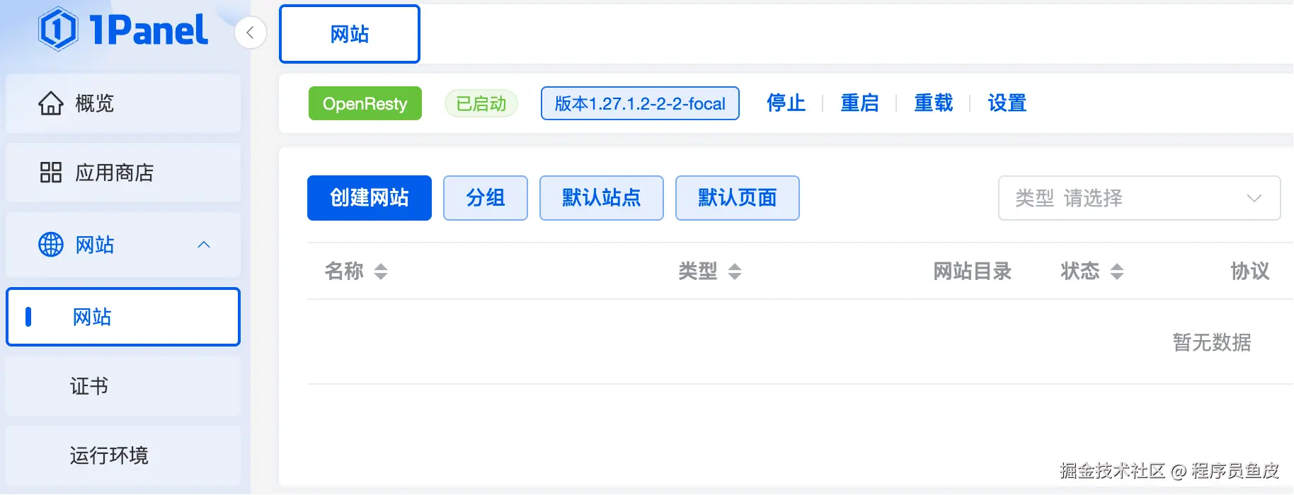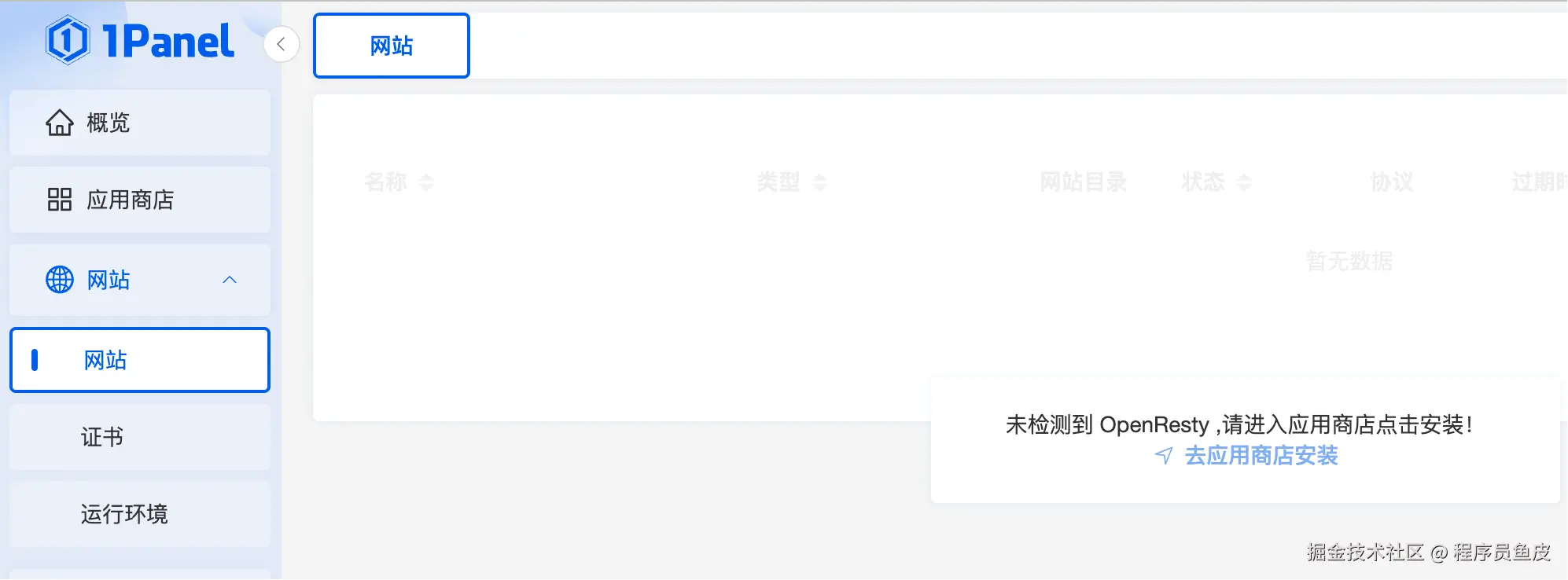 进入 网站 板块,面板会提醒我们安装 OpenResty: