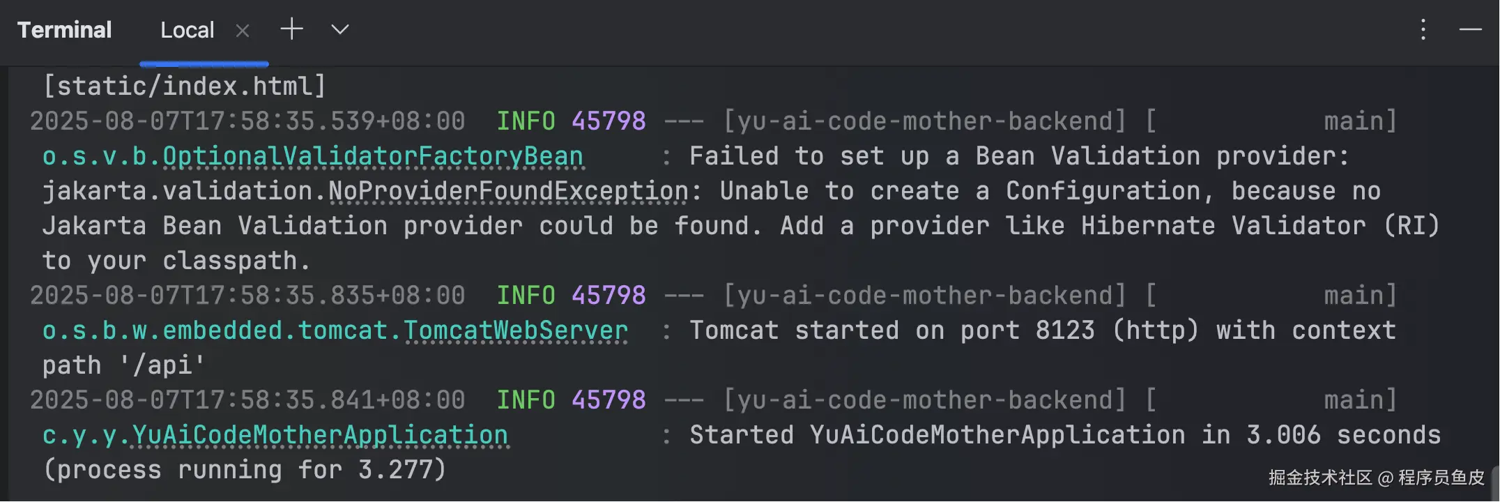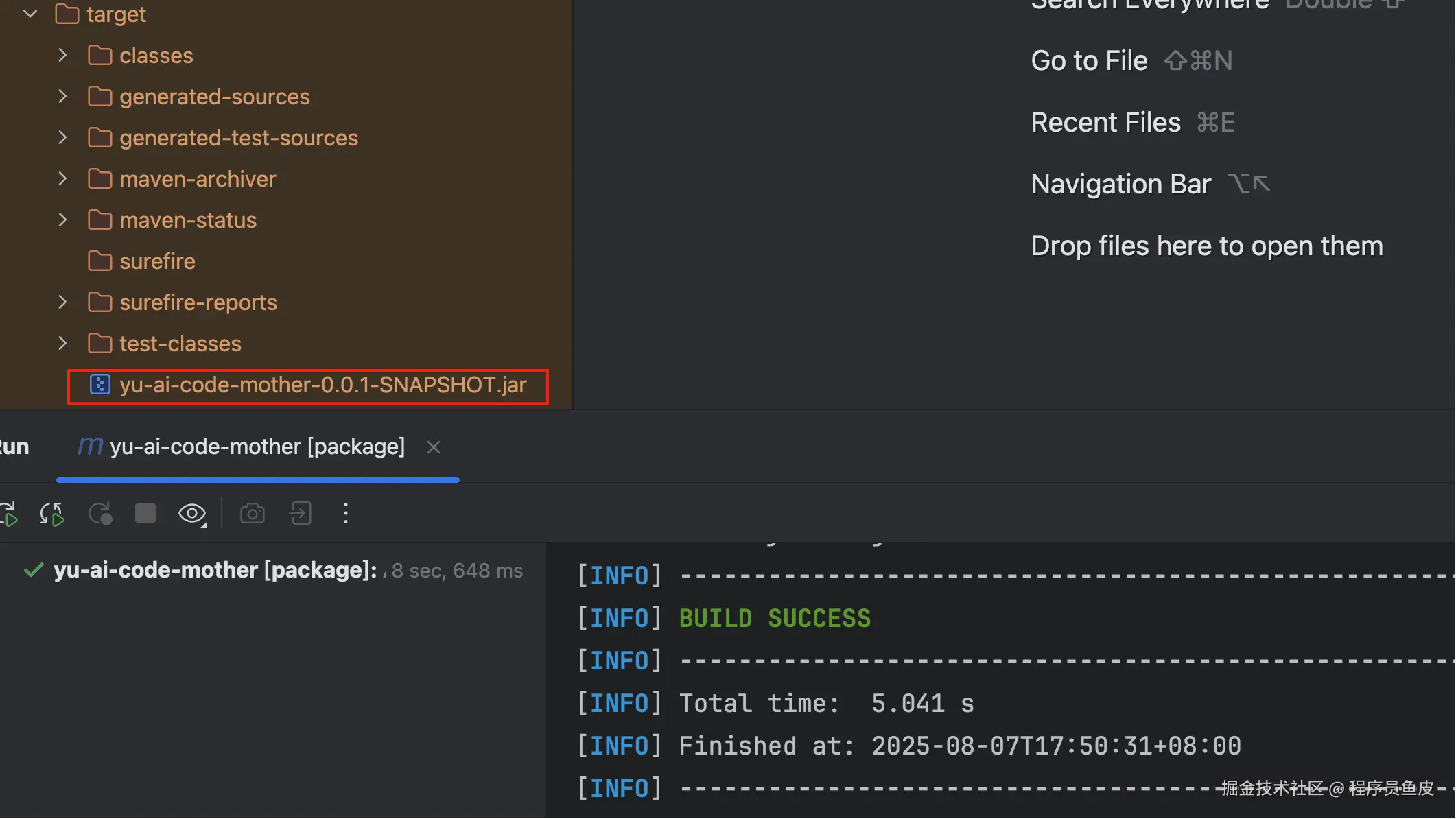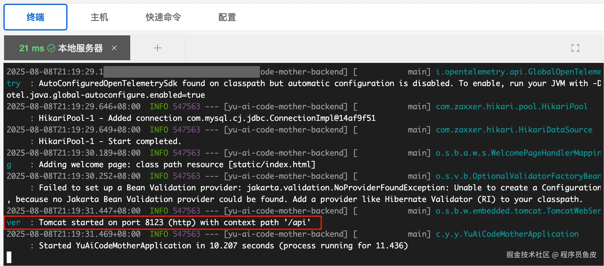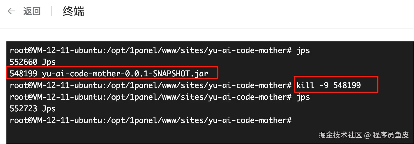 接下来进入 jar 包所在目录 /project/yu-ai-code-mother-backend 的终端,先在前台运行 jar 包: